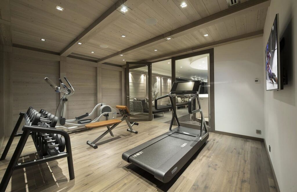 The spa is where Chalet Anio shows its personality. A long indoor pool stretches beneath low lighting, its surface reflecting the wood beams above. Nearby are a hammam, sauna and fitness room, as well as a small bar and rest area where guests often pause after a swim. It’s a space made for slowing down after an intense day on the slopes.