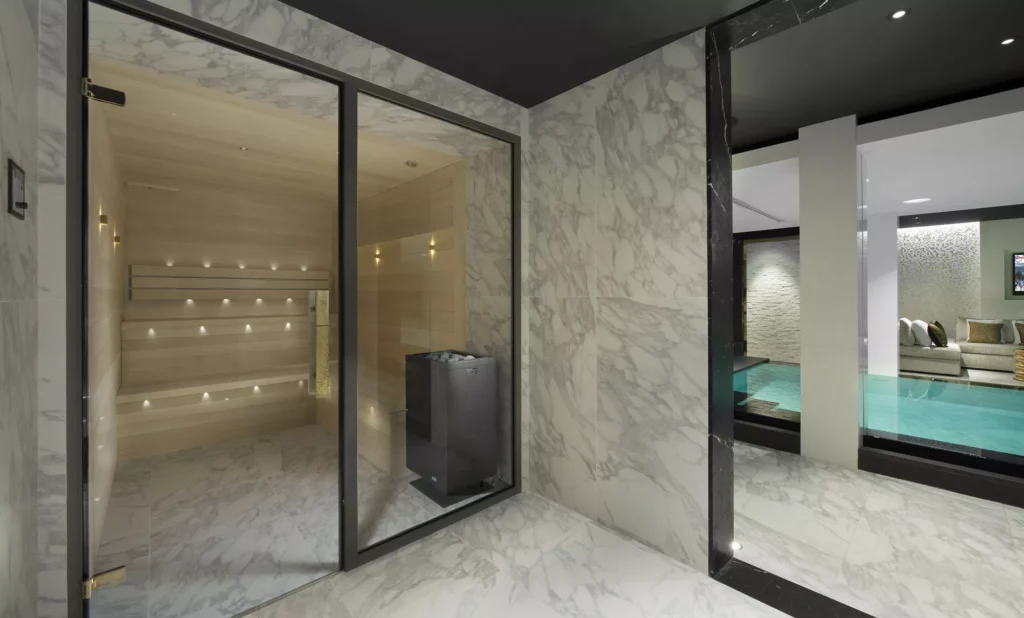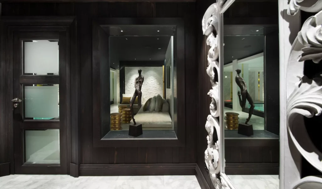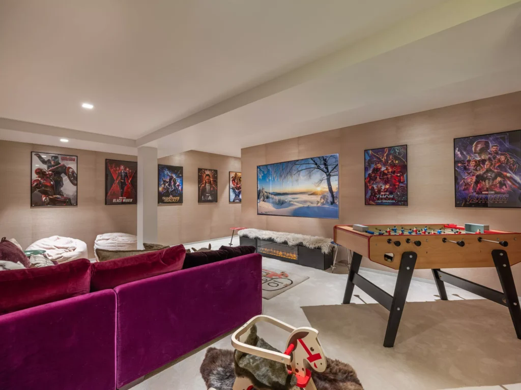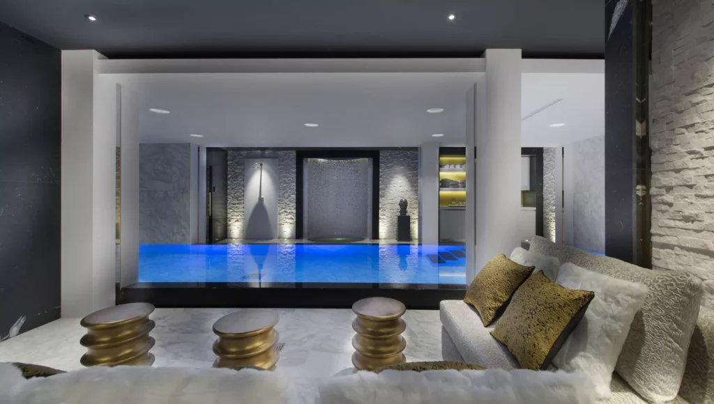 The lower levels are designed entirely for unwinding. The spa floor includes a ten-metre indoor pool, Jacuzzi, hammam, sauna, massage room, and gym, providing everything needed to recover from long ski days or simply take a slow afternoon off. A cinema room is another space to relax, tucked beside the ski room and private garage with a car lift.