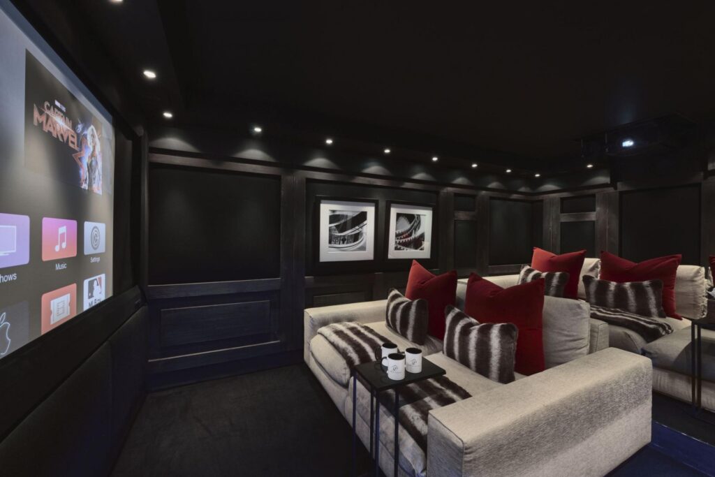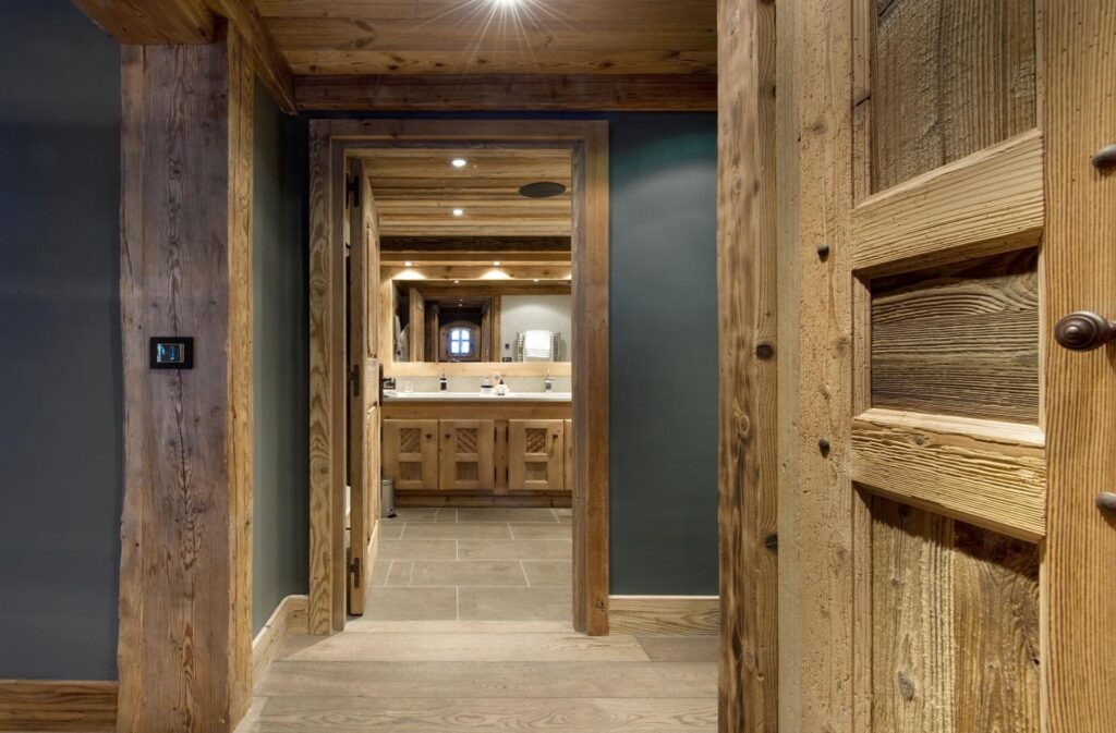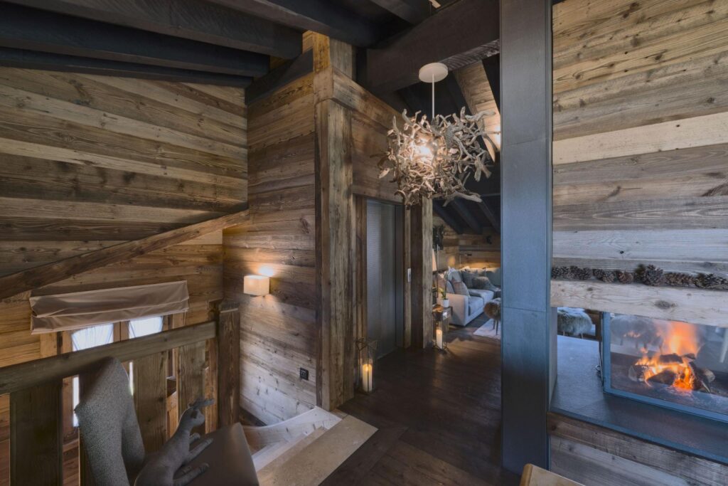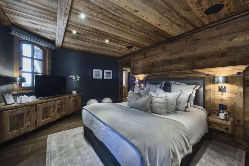 Spread over five floors connected by both stairs and an elevator, the chalet offers seven en-suite bedrooms. The master suite occupies the top level, where large windows frame views of pine forests and snowy peaks. With its private balcony, sitting area, fireplace, dressing room, and spacious bathroom, it’s a peaceful retreat designed for your comfort.