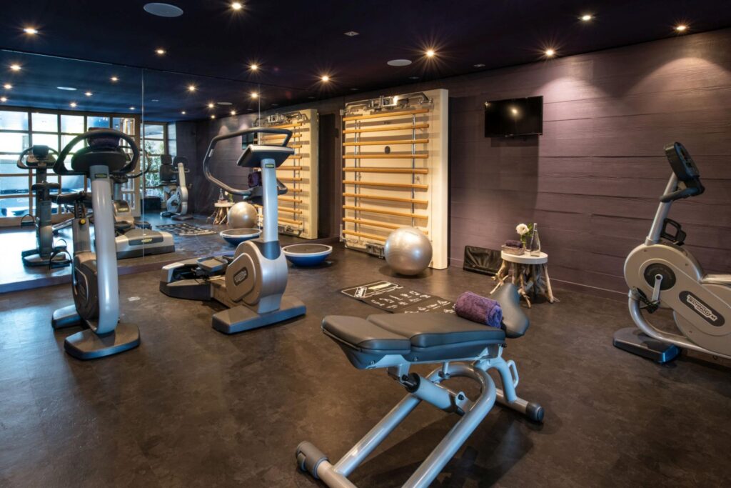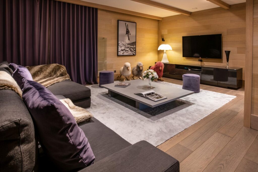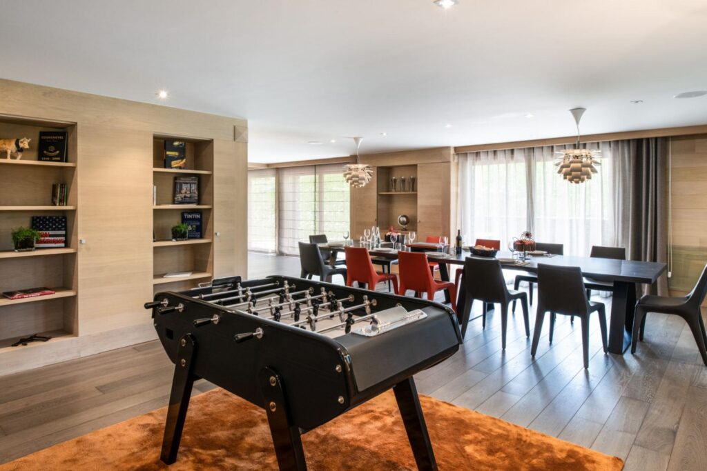 Chalet Lily’s wellness and recreation area features a heated indoor swimming pool with a starry-sky ceiling that draws attention, accompanied by an indoor Jacuzzi, hammam, and relaxation space. Large windows bring in natural light, offering glimpses of snow-covered slopes and surrounding forest. For those willing to maintain their daily fitness routine, a small fitness area ensures that guests can do so without leaving the chalet. Apart from the wellness area, the chalet features a games room providing entertainment for all ages, where children can play safely while adults relax nearby.