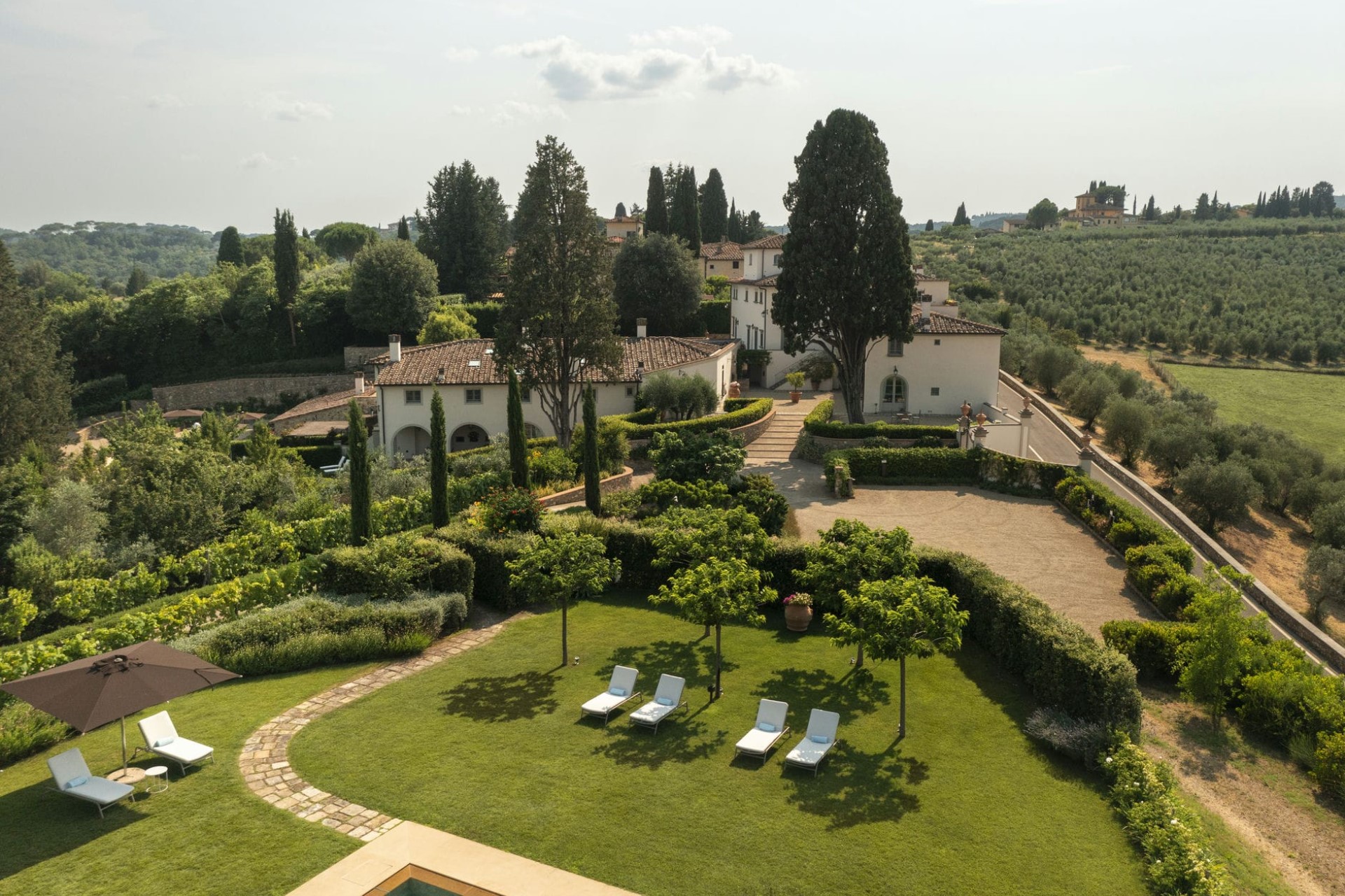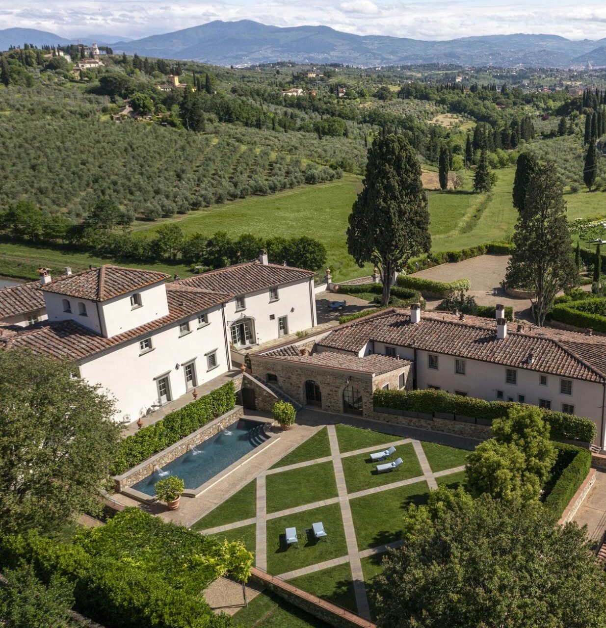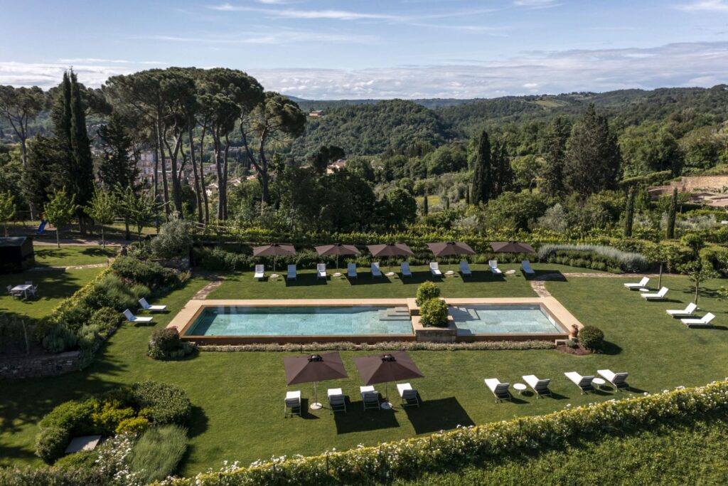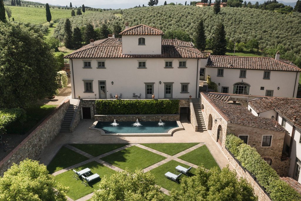 Surrounded by the famous rolling green hills lined with cypresses and embraced by 30 acres of vineyards, olive groves, forest and a lake, Villa Dahlia, with its magnificent position overlooking Florence, is a true postcard image of Tuscany.