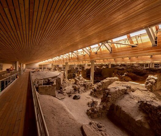 The ancient site of Akrotiri in Santorini is a remarkably preserved Minoan settlement, often linked to the legend of Atlantis. Buried by a volcanic eruption around 1600 BC, its multi-story buildings, frescoes, and advanced infrastructure offer a fascinating glimpse into Bronze Age life and the island’s rich archaeological history.