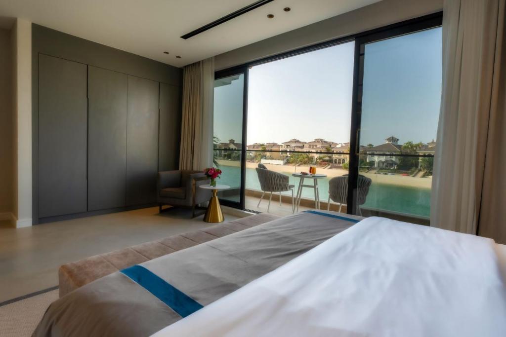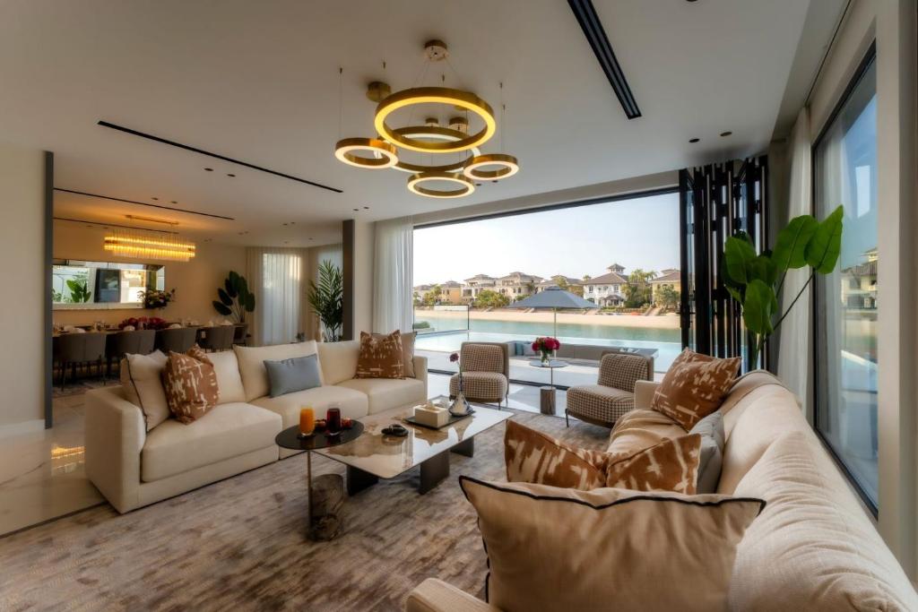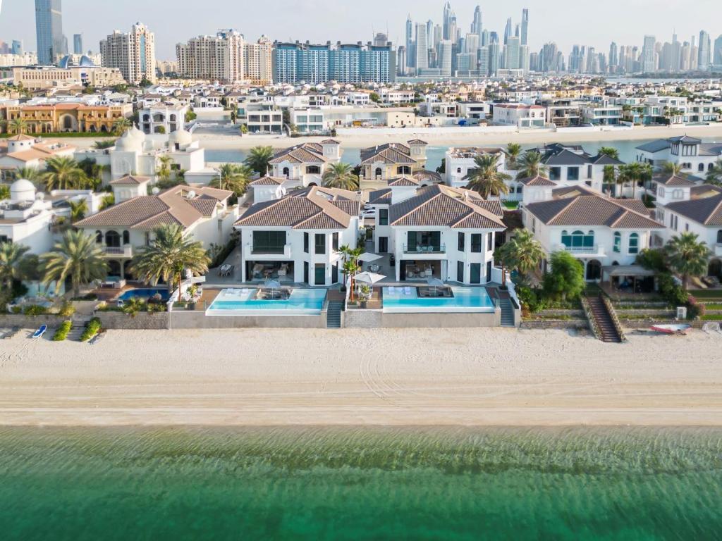 Set on Frond M Beach, the villa offers direct access to a private stretch of sand, a shimmering infinity pool, and beautifully landscaped gardens designed for enjoying the outdoors.