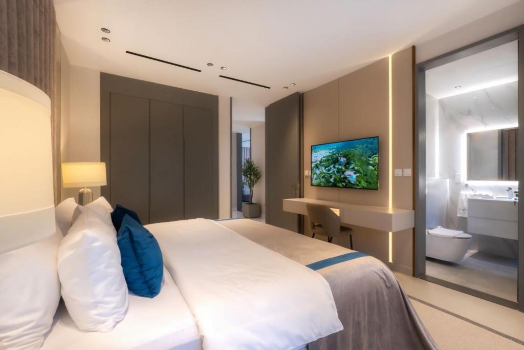The villa has six spacious bedrooms and seven stylish bathrooms, all featuring walk-in showers and bidets. The open-plan living area comes with a satellite flat-screen TV, while the fully equipped kitchen makes it easy to prepare meals. Expansive balconies and a sea-facing patio provide breathtaking views, and the outdoor dining area overlooking the pool is ideal for leisurely meals by the water.