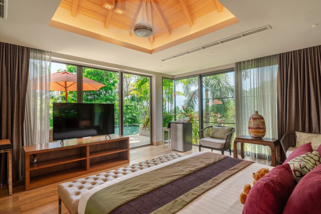 Inside, Villa Jantra offers seven bedrooms, all with terrace access and ensuite bathrooms. The master suite overlooks the pool and includes a king-size bed, sofa, desk, TV, walk-in wardrobe, and a modern ensuite shower room, with large windows offering views of the jungle and ocean. Other bedrooms include twin and king-size options, each with seating areas, terraces, and built-in wardrobes.