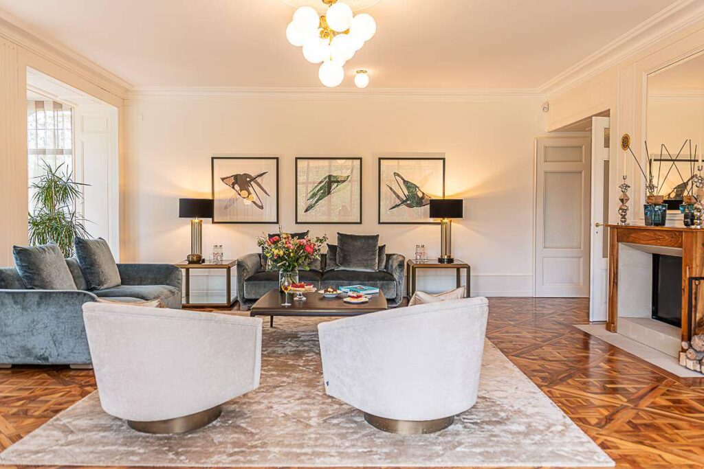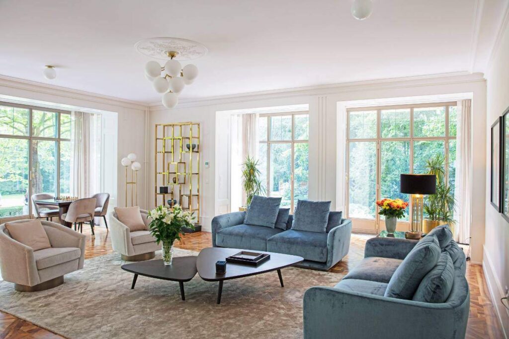 The interiors feature contemporary European design with subtle Art Deco influences. Clean architectural lines and polished surfaces are complemented by classic details, such as herringbone parquet floors, decorative moldings, and traditional wood paneling.