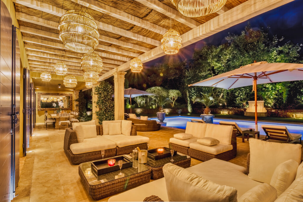 The villa offers 400 m² of living space on a 2,000 m² plot, featuring three living areas, a fireplace in the main lounge, a fully equipped kitchen, a TV lounge, six bedrooms, five bathrooms, and a balcony. Outside, a covered terrace and pool run along the length of the house, perfect for alfresco dining and enjoying the outdoors.